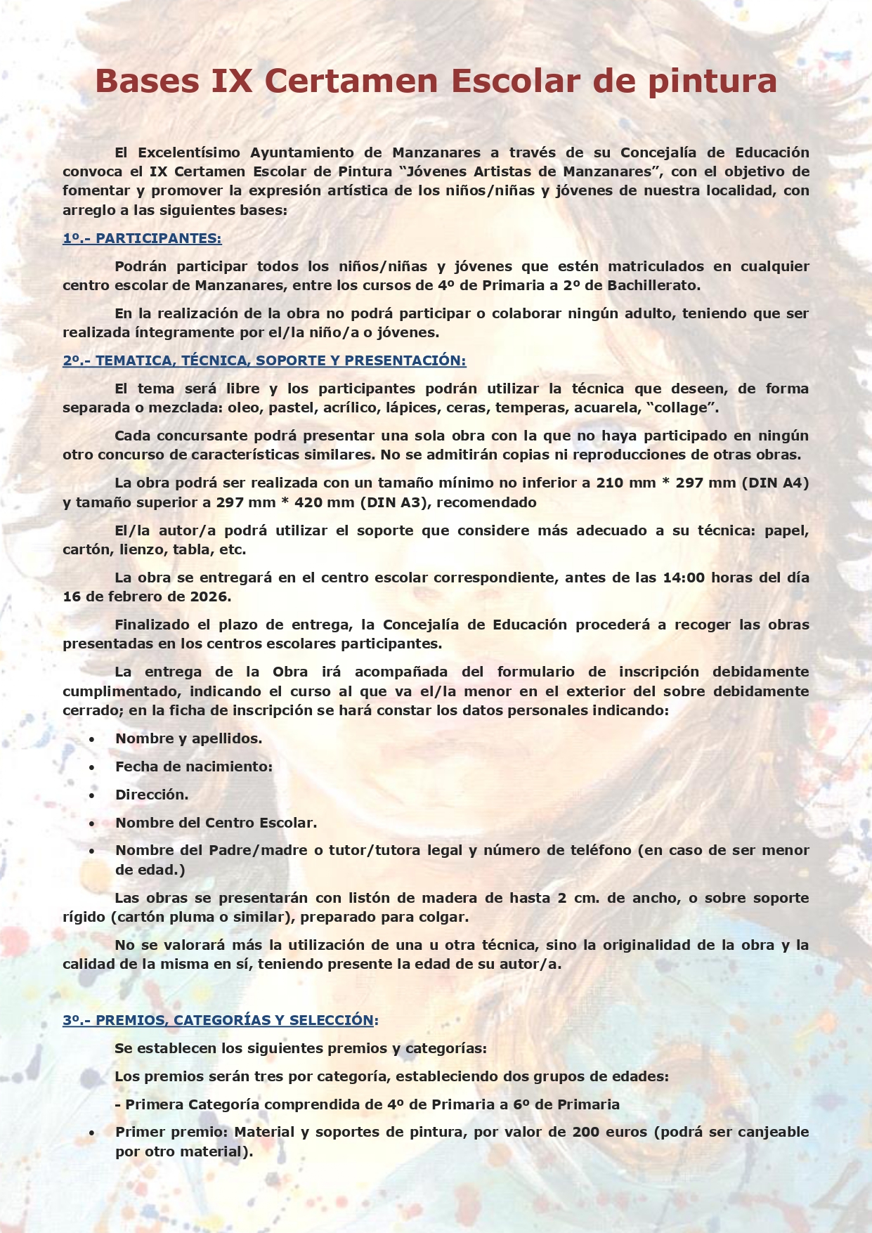 La concejalía de Educación del Ayuntamiento de Manzanares ha publicado las bases de la IX edición del Certamen Escolar de Pintura 'Jóvenes Artistas de Manzanares'. Esta nueva convocatoria llega con el firme objetivo de fomentar y promover la expresión artística entre los y las estudiantes de la localidad. Pasa asegurar una competencia equilibrada y motivadora para todo el alumnado, se ha creado una nueva categoría.