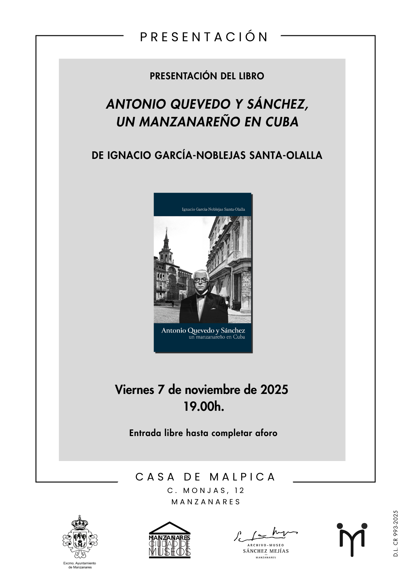El viernes, Museos de Manzanares nos propone a las 19 horas una nueva actividad en la sala polivalente de Casa Malpica. Se trata de la presentación del libro ‘Antonio Quevedo y Sánchez, un manzanareño en Cuba’, de Ignacio García-Noblejas Santa-Olalla. El libro desvela, por primera vez, la increíble y desconocida trayectoria de una figura destacada en la vida artística y literaria de Cuba en la primera mitad del siglo XX, quien acogió en La Habana a García Lorca y a Juan Ramón Jiménez, entre otros. La entrada es gratuita hasta completar aforo.
