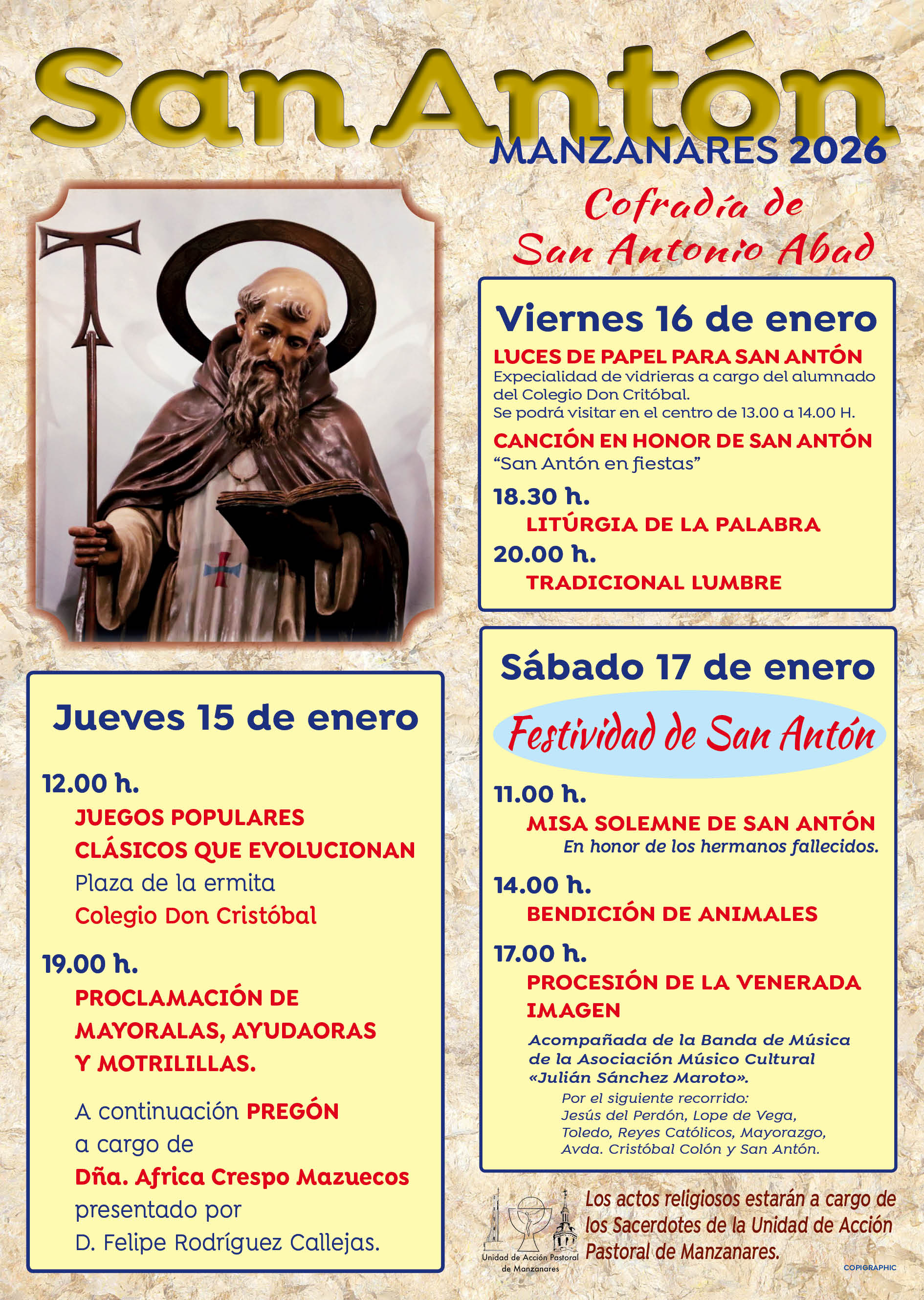 El sábado 17, festividad de San Antonio Abad, se celebrará a las 11:00 horas la misa solemne de San Antón en su ermita, donde a las 14:00 horas se procederá a la bendición de animales. La procesión con el santo comenzará a las cinco de la tarde con la participación de la banda de música ‘Julián Sánchez-Maroto’. Pasará por las calles Jesús del Perdón, Lope de Vega, Toledo, Reyes Católicos, Mayorazgo, Cristóbal Colón y San Antón.