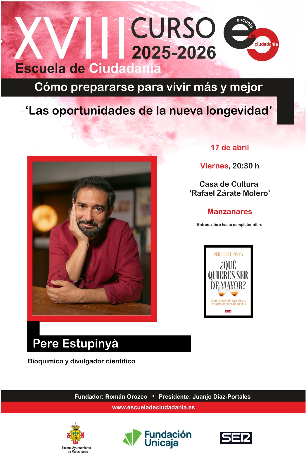 El bioquímico y divulgador científico Pere Estupinyà hablará el próximo 17 de abril en la Escuela de Ciudadanía de Manzanares de las oportunidades de la nueva longevidad y de cómo prepararnos para vivir más y mejor. Será uno de los primeros actos de presentación de su nuevo libro: ¿Qué quieres ser de mayor? Cómo convertir la madurez en la mejor etapa de tu vida.