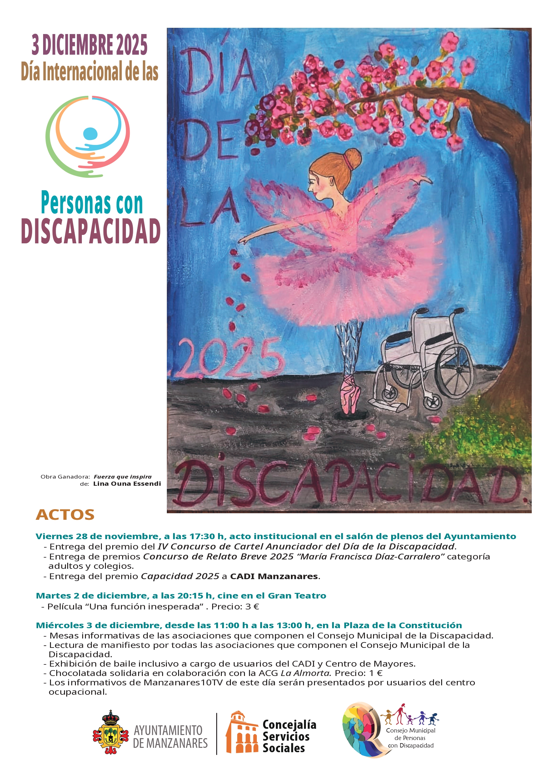 La concejalía de Servicios Sociales del Ayuntamiento de Manzanares ha presentado el programa de actos por el Día Internacional de las Personas con Discapacidad. Las actividades, que se desarrollarán del viernes 28 de noviembre al miércoles 3 de diciembre, buscan poner de manifiesto la apuesta del Ayuntamiento y el Consejo Municipal de la Discapacidad por “la inclusión y la plena participación de todas las personas en la vida social y cultural de Manzanares”.